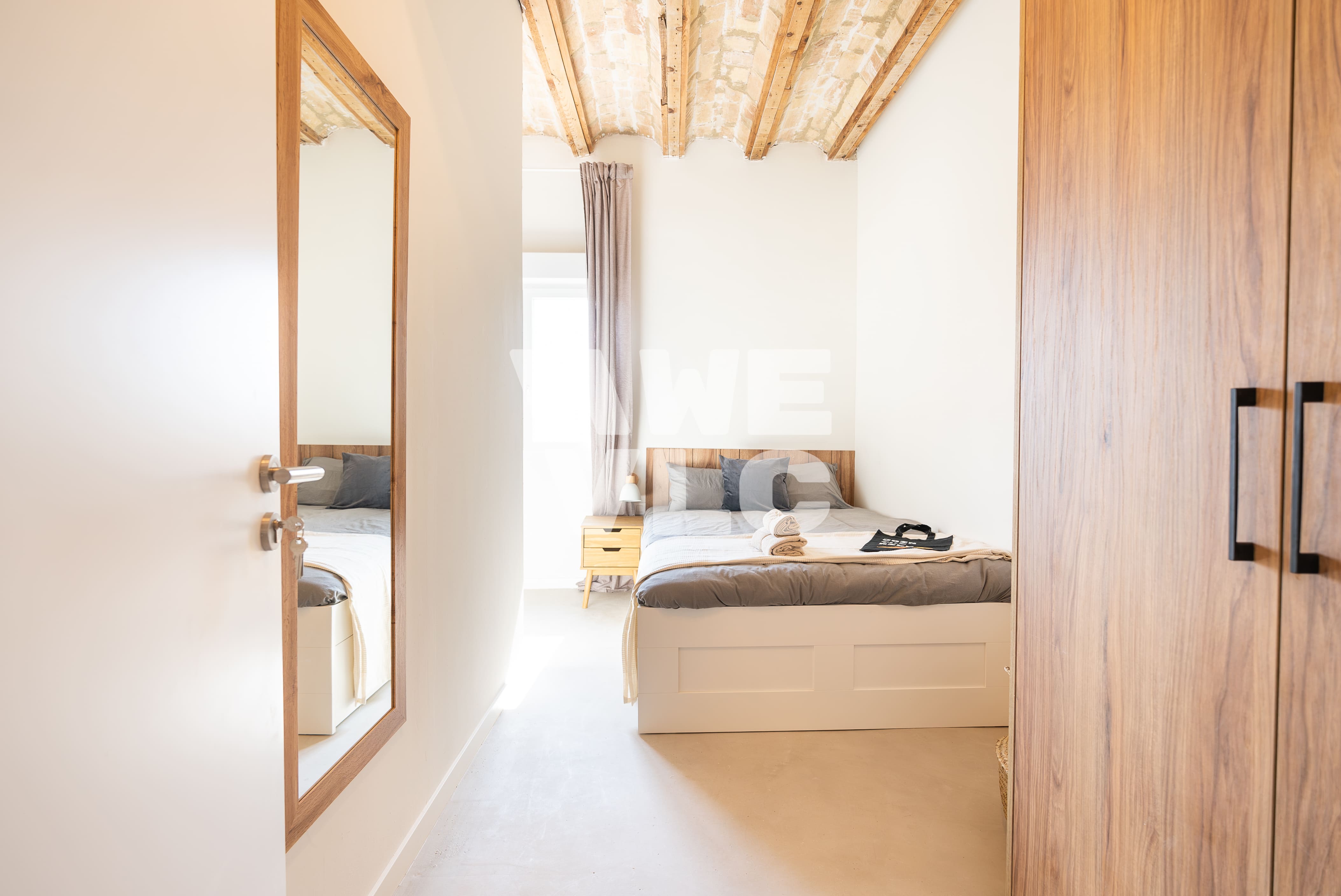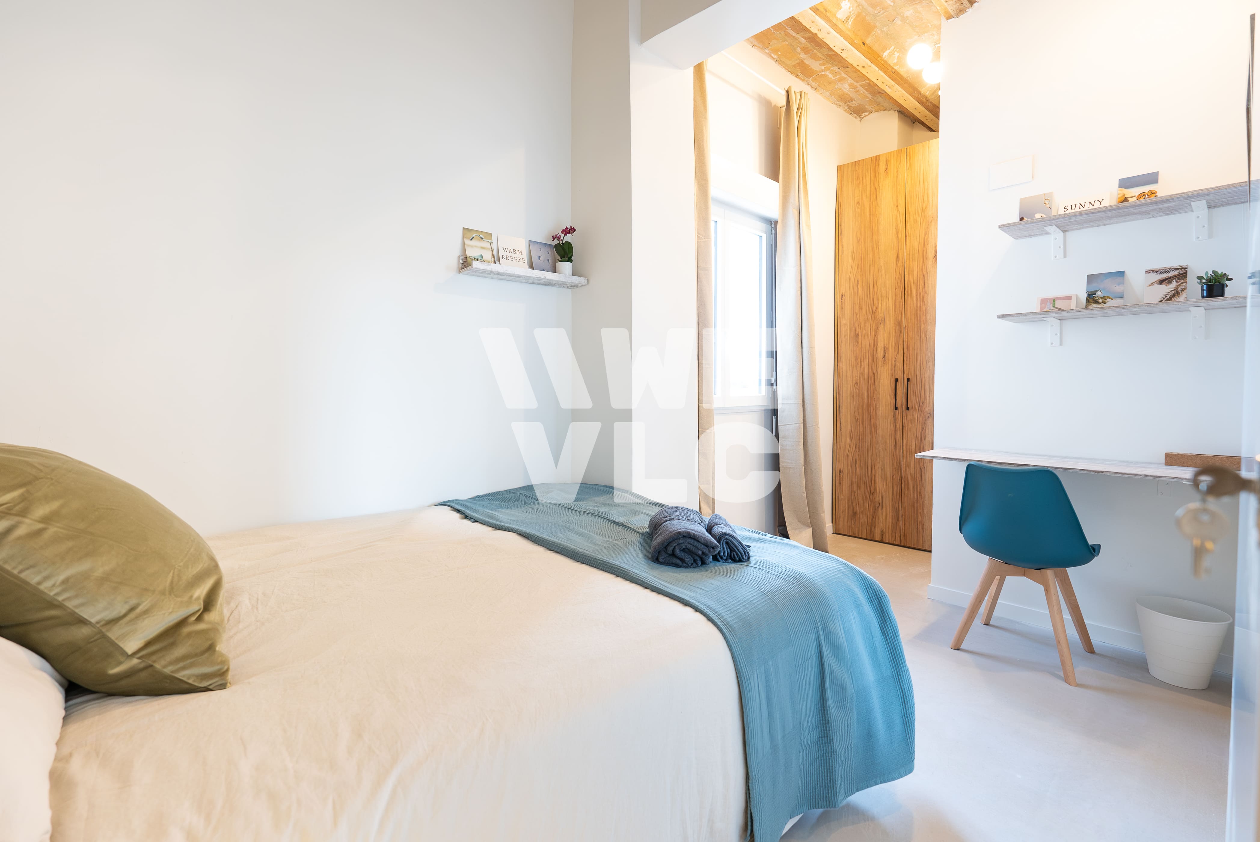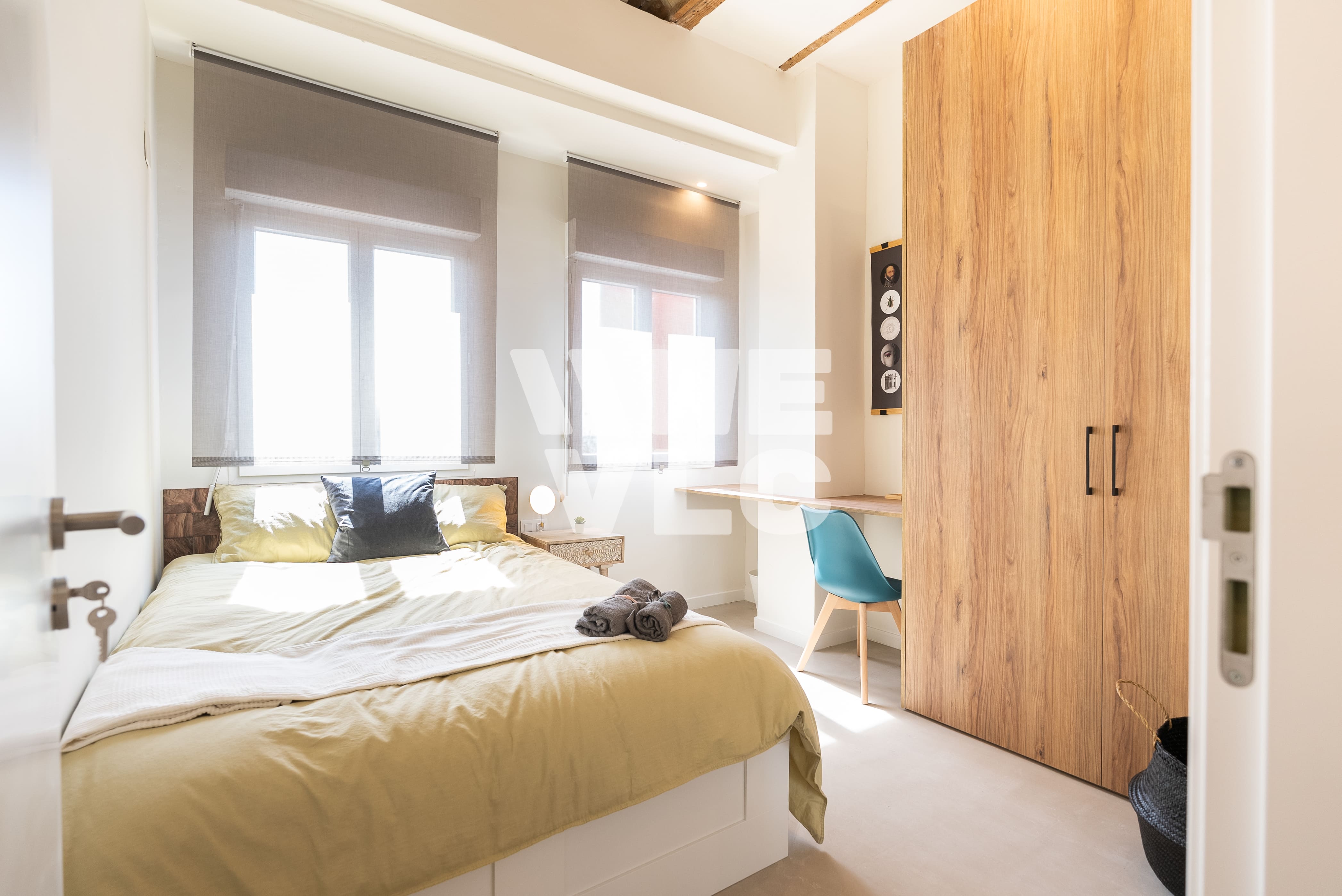 A spacious room filled with natural light. Equiped with study desk, and air conditioning, ideal for comfort and work in Valencia's climate.