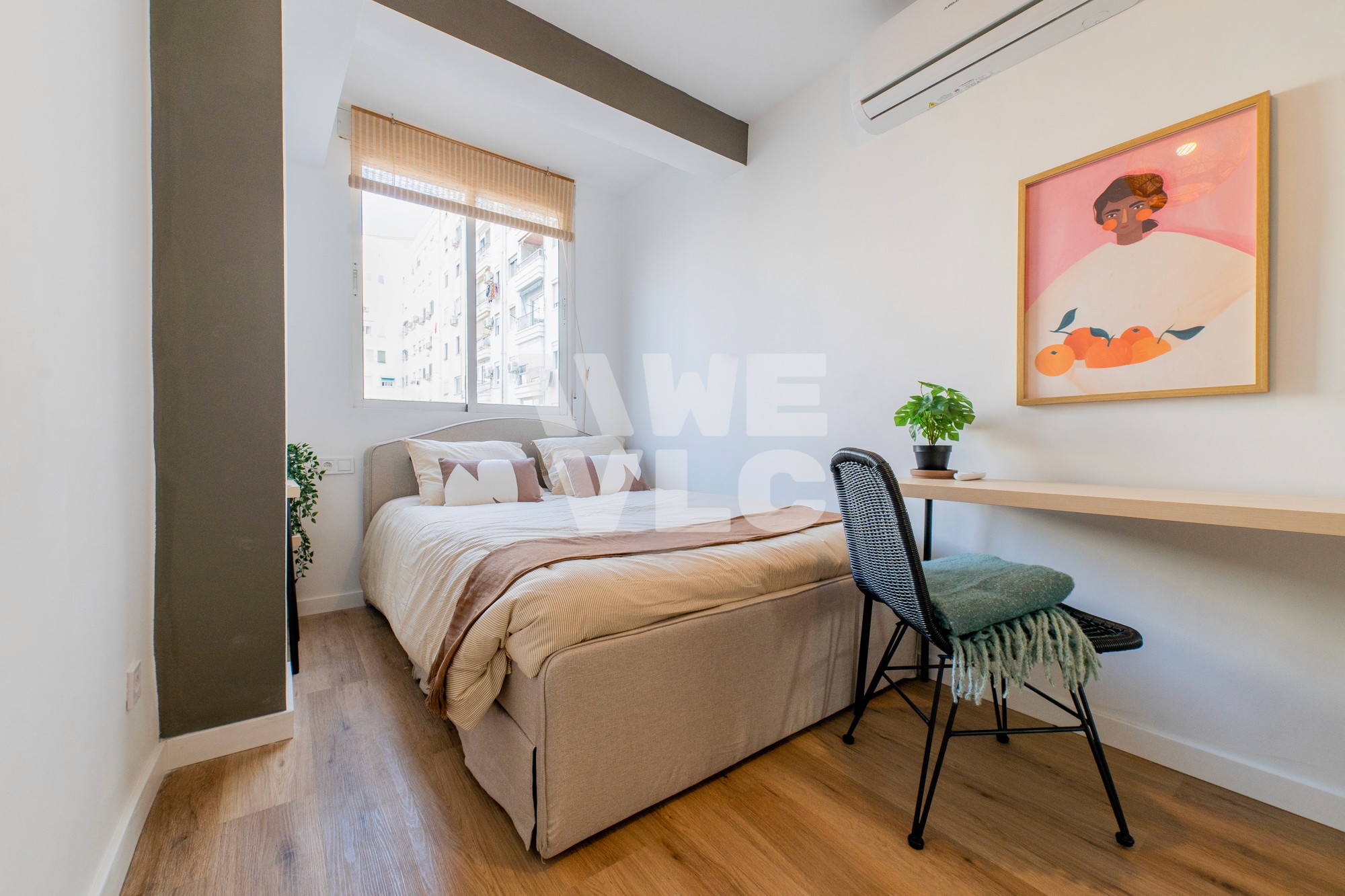 A fully renovated room with air conditioning, a double bed, and a study desk, offering comfort and a modern, move-in ready environment.