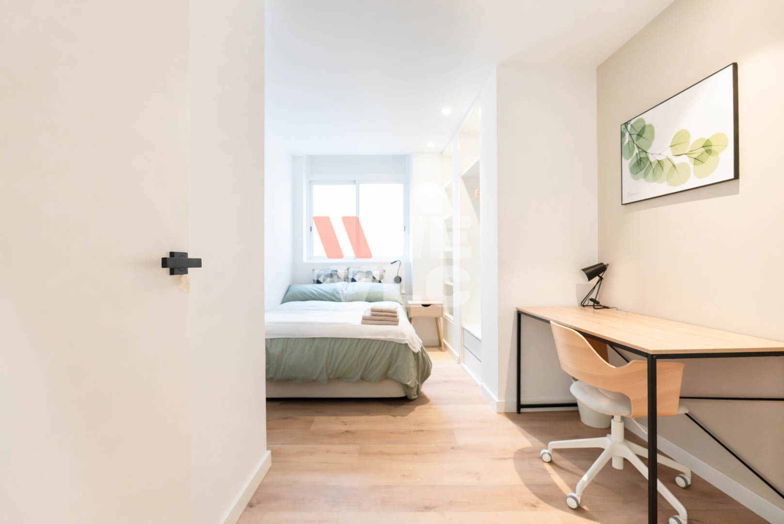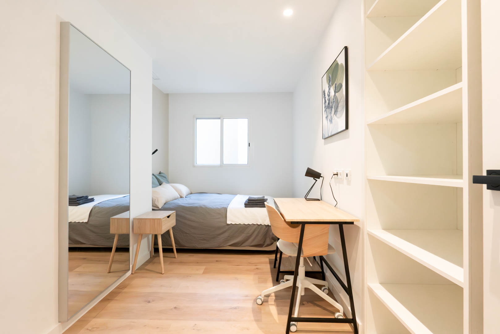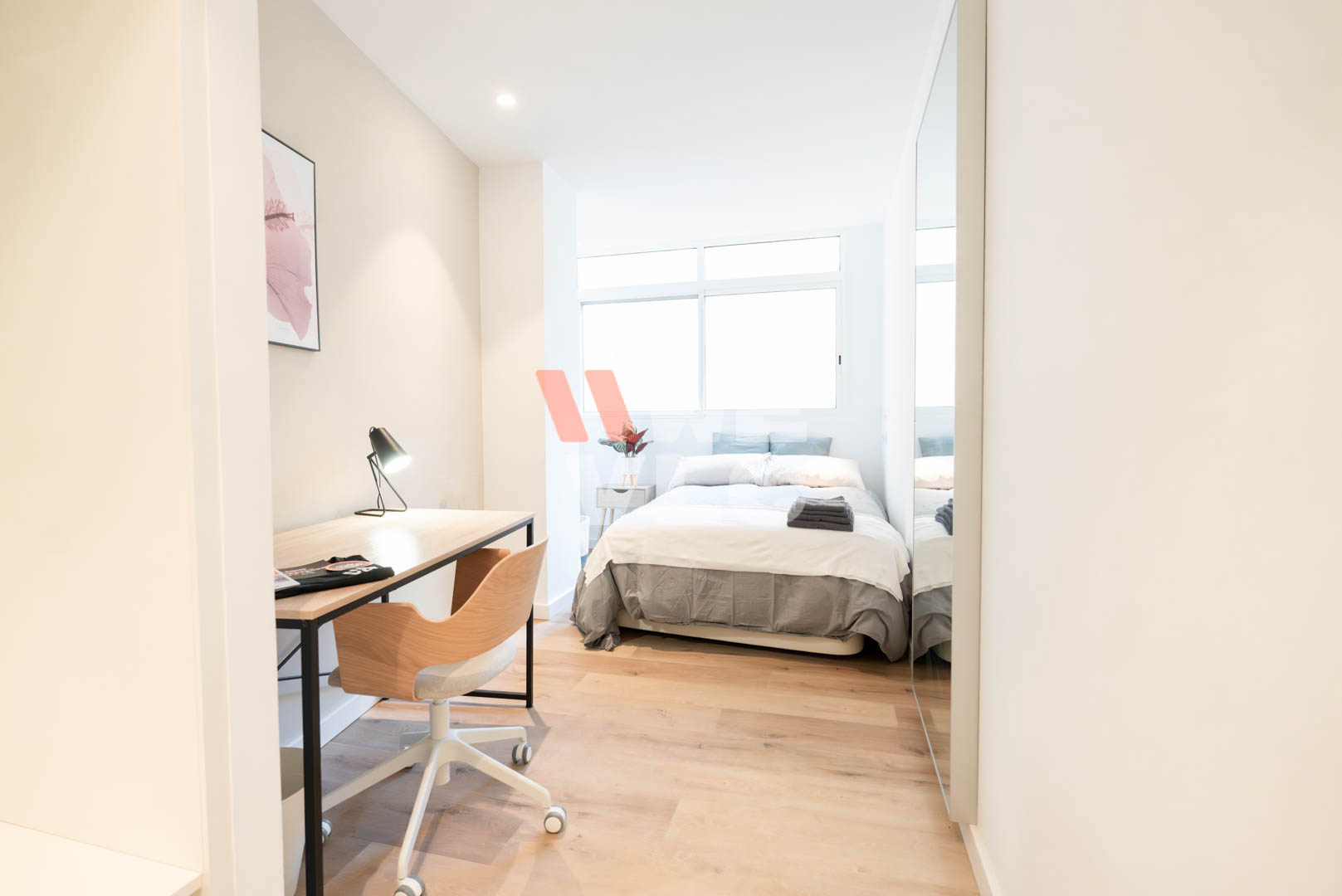 A fully renovated room with air conditioning, and a large built in wardrobe, offering comfort and modern amenities.