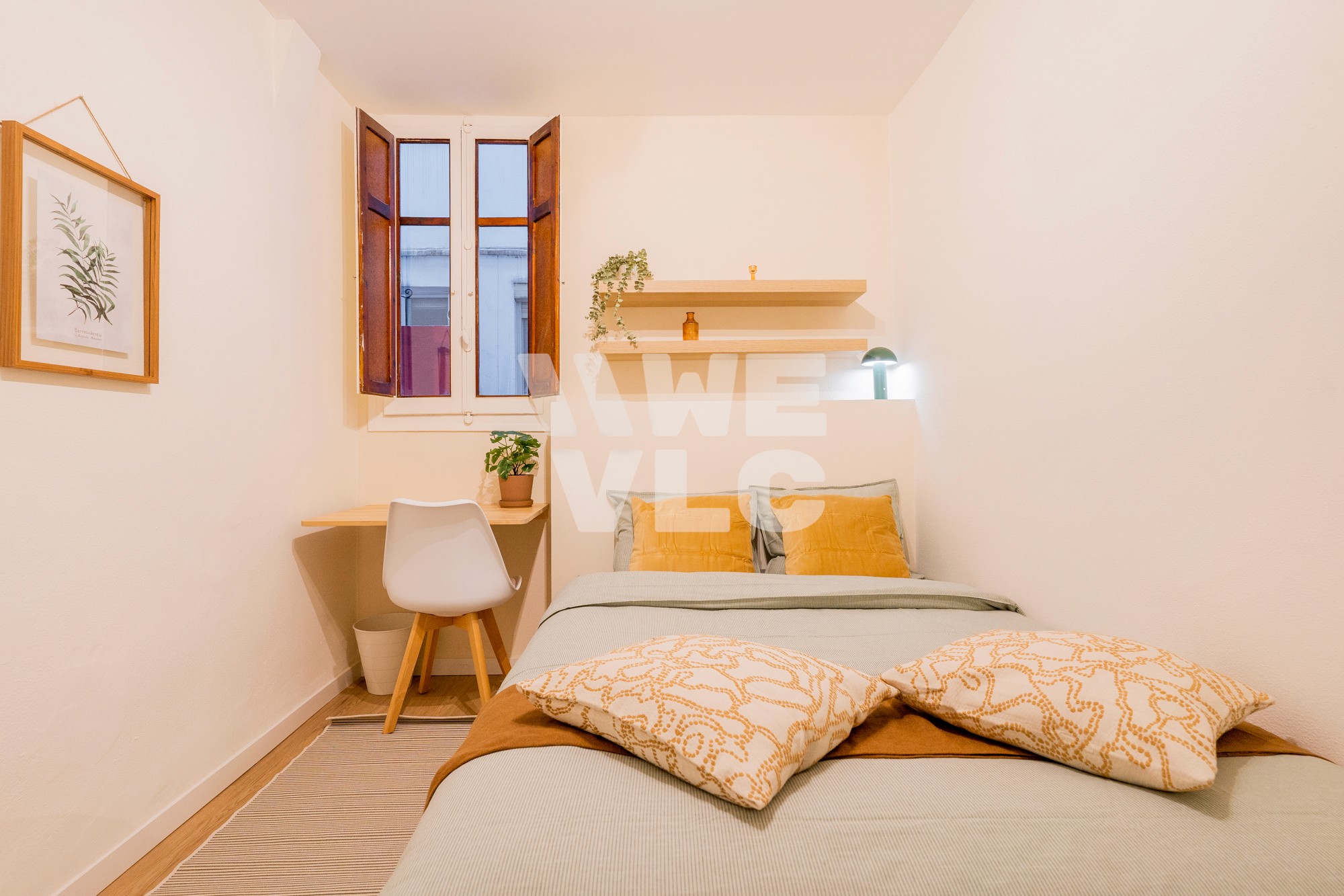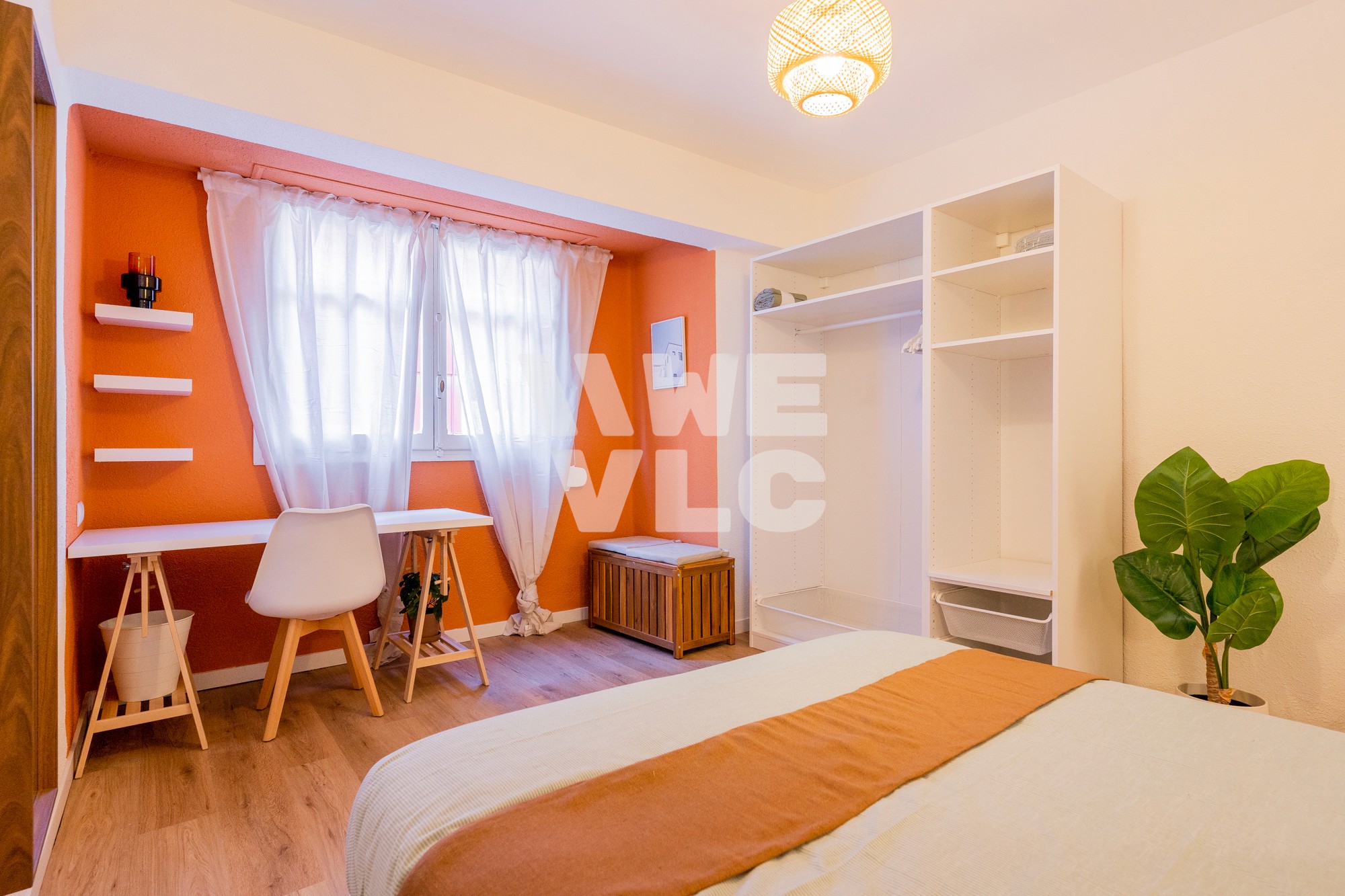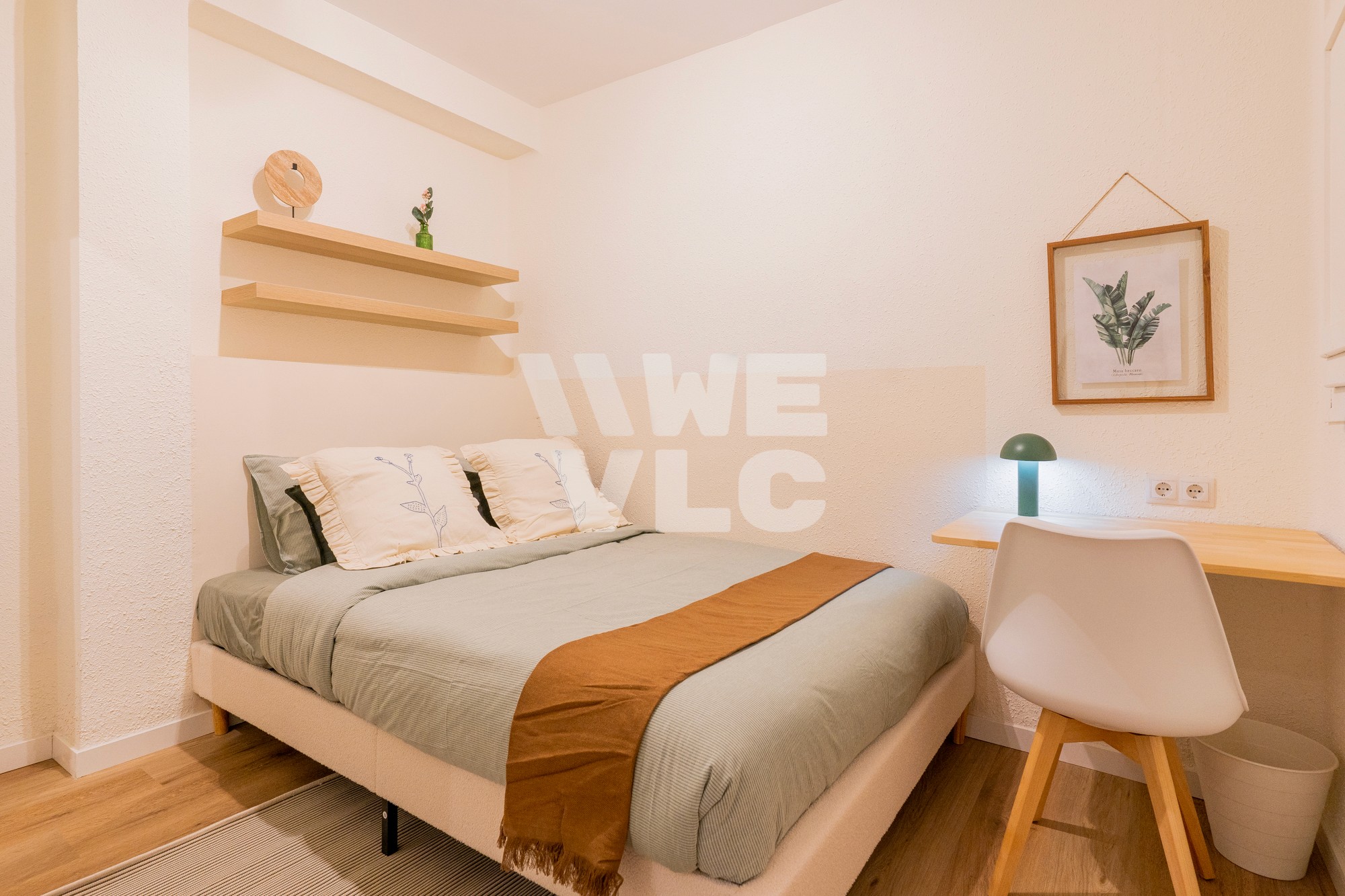 A bright, spacious room with a double bed, study desk, ample storage, and modern finishes, ideal for comfort and productivity.