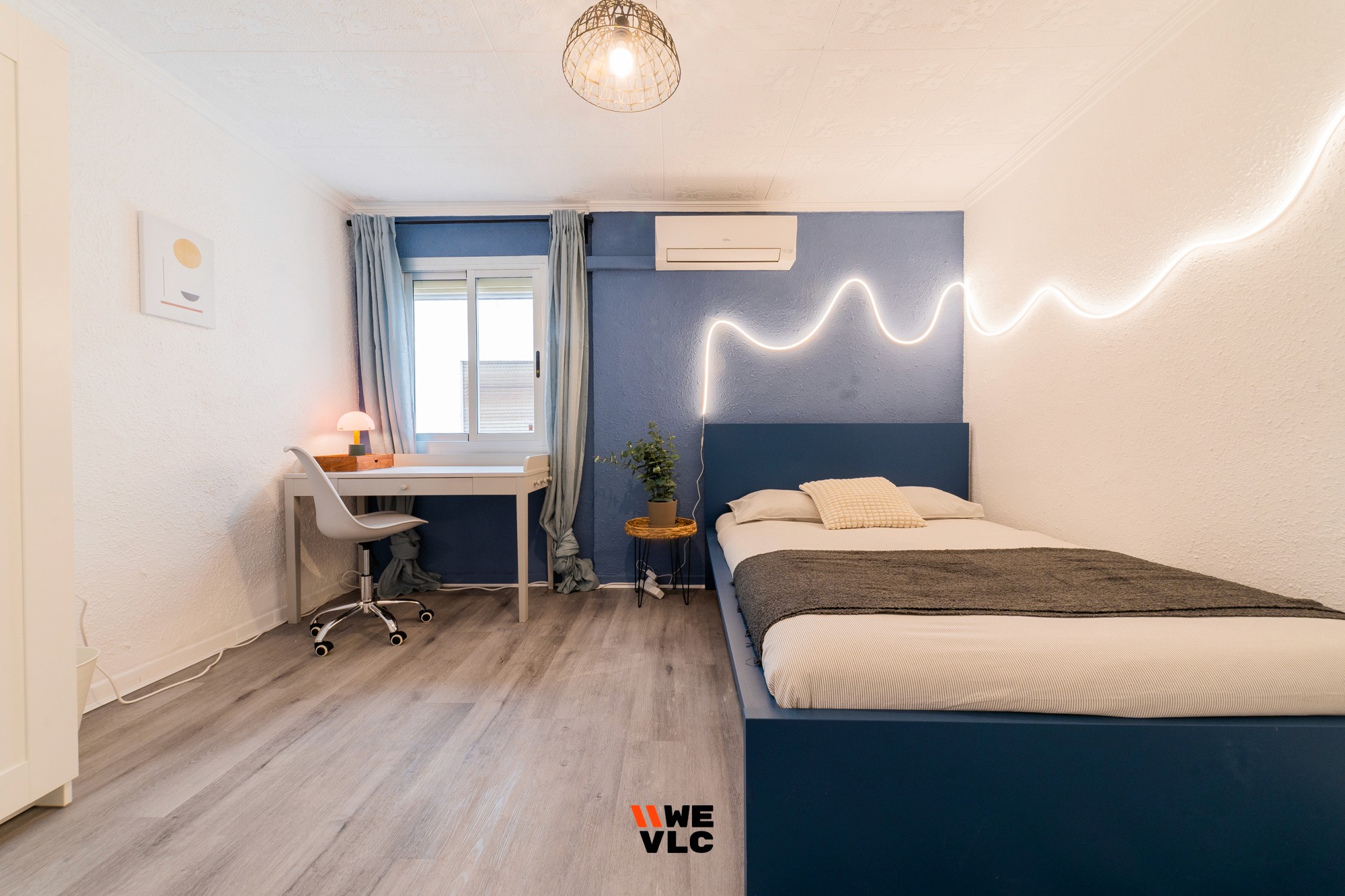 Een heldere, gerenoveerde kamer met een tweepersoonsbed, studietafel en airconditioning, ideaal voor comfort en werk in het klimaat van Valencia.