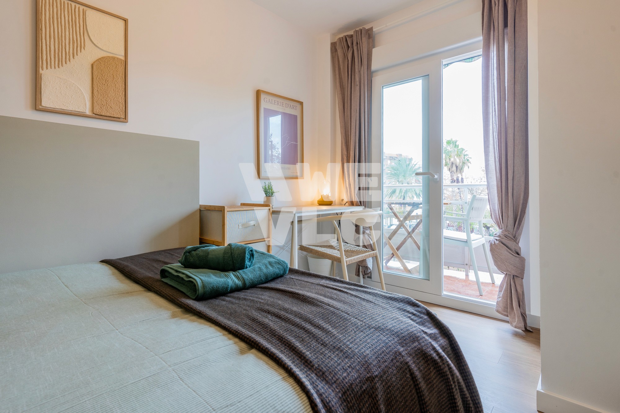 Heldere kamer met een privébalkon, airconditioning, een tweepersoonsbed, bureau en moderne afwerkingen, ideaal voor comfort en productiviteit.