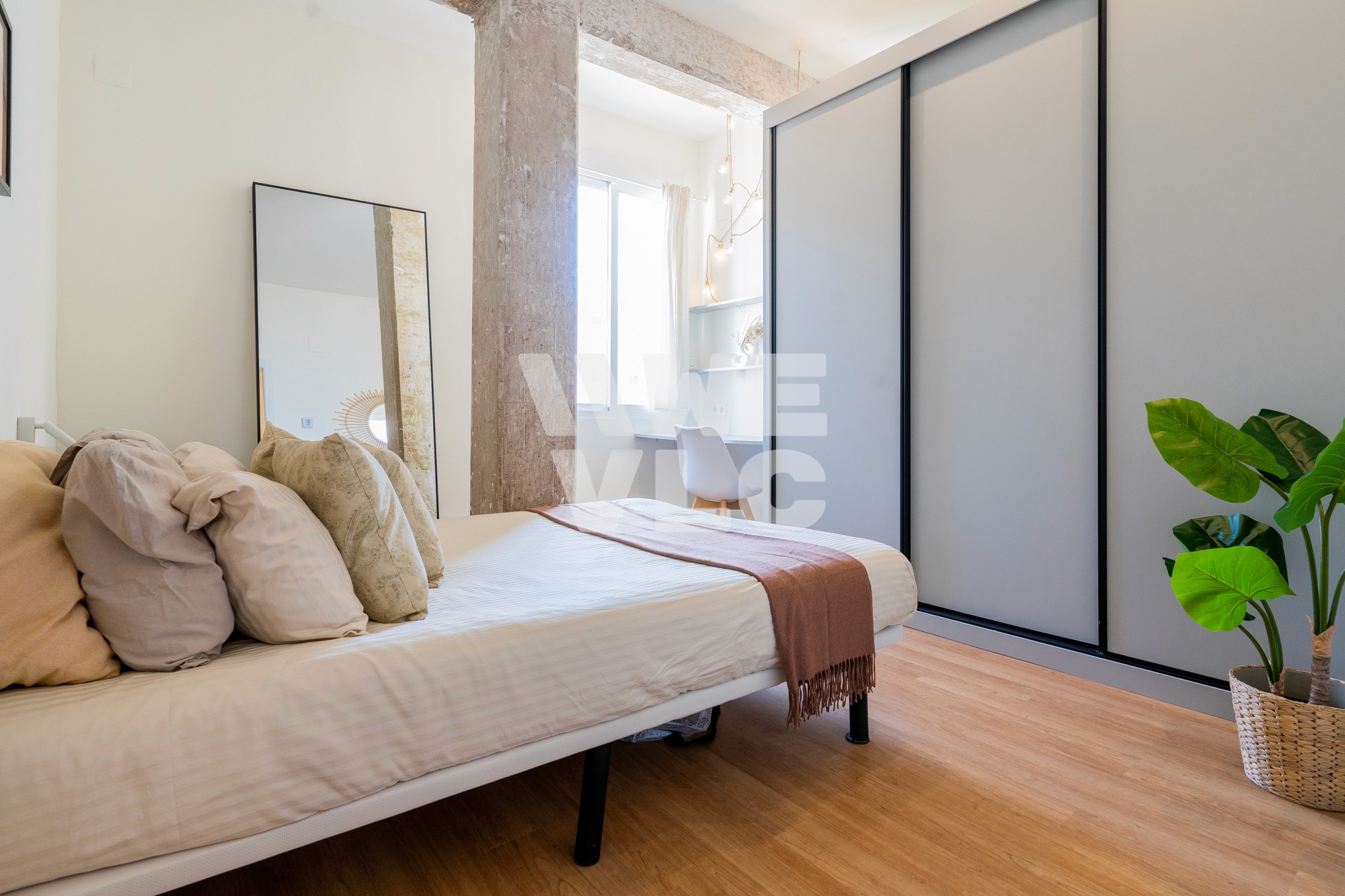 Bright renovated room with air conditioning, a double bed, study desk, and large wardrobe, offering comfort and modern amenities.