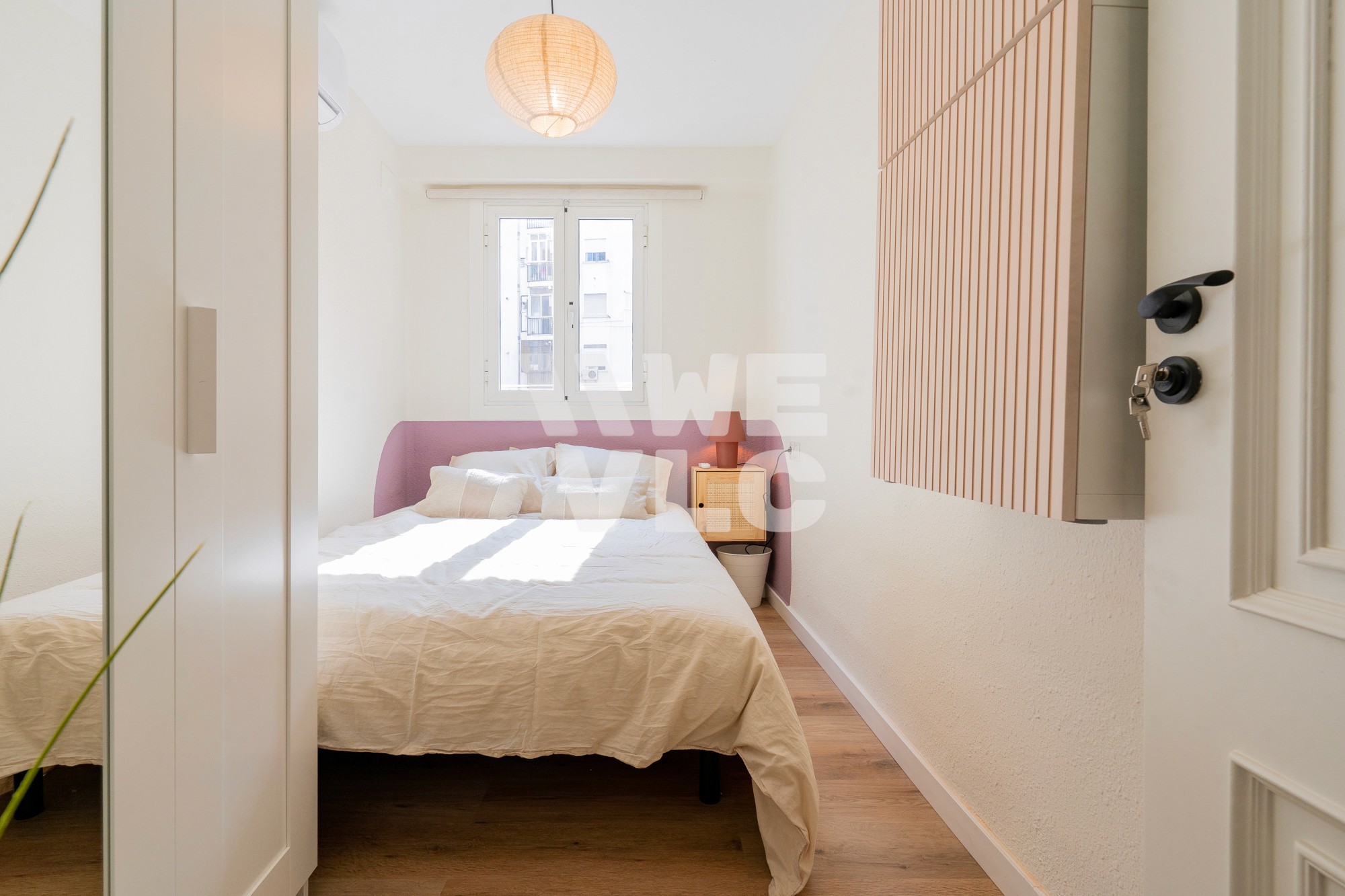 Bright, fully renovated room with air conditioning, a spacious double bed, and abundant natural light for a welcoming atmosphere.